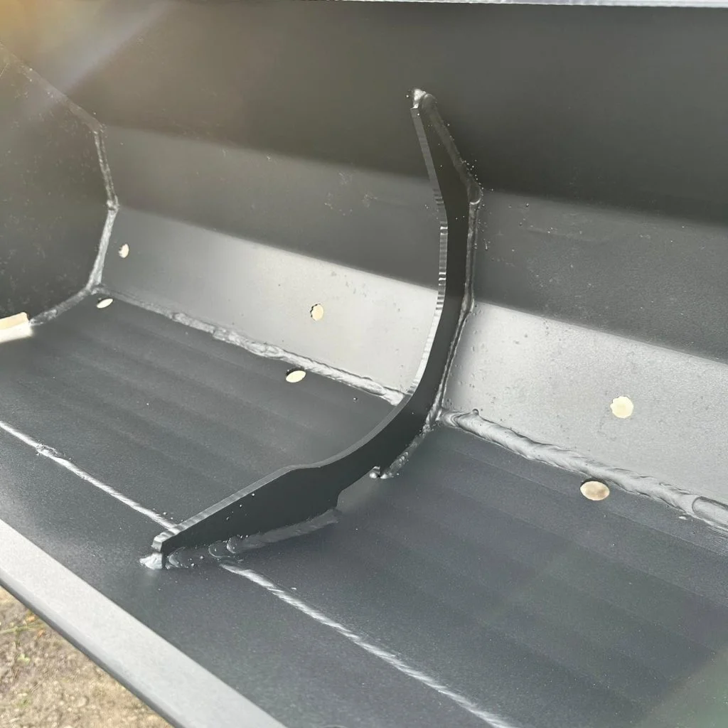 - FONDO RINFORZATO CON PREDISPOSIZIONE PER IL MONTAGGIO DEL RASOIO- Tutte le benne della serie "PFO" hanno il fondo benna rinforzato e forato di serie. Su questi fori è possibile montare il kit rasoio composto da un tagliente reversibile a doppio smusso realizzato in acciaio antiusura da 400 Brinnel e dai bulloni a testa svasata quadra a scomparsa per lavori di estrema precisione. Il kit è intercambiabile con quello del salvalama.