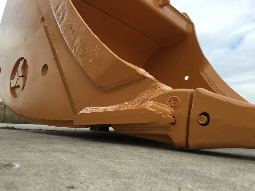 Il tagliente fuoriesce dalla sagoma della benna di qualche centimetro per consentire l'applicazione di più cordoni di saldatura destinati ad unire tagliente, dente d'angolo e fiancata